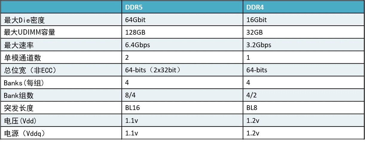 DDR5从3.2Gbps起跳,到6.6Gbps,起点即是DDR4的速度峰值。DDR5最高可扩展到8.4Gbps,预取数据能力从DDR4的8n上升为 16n。